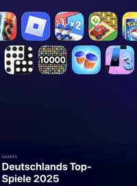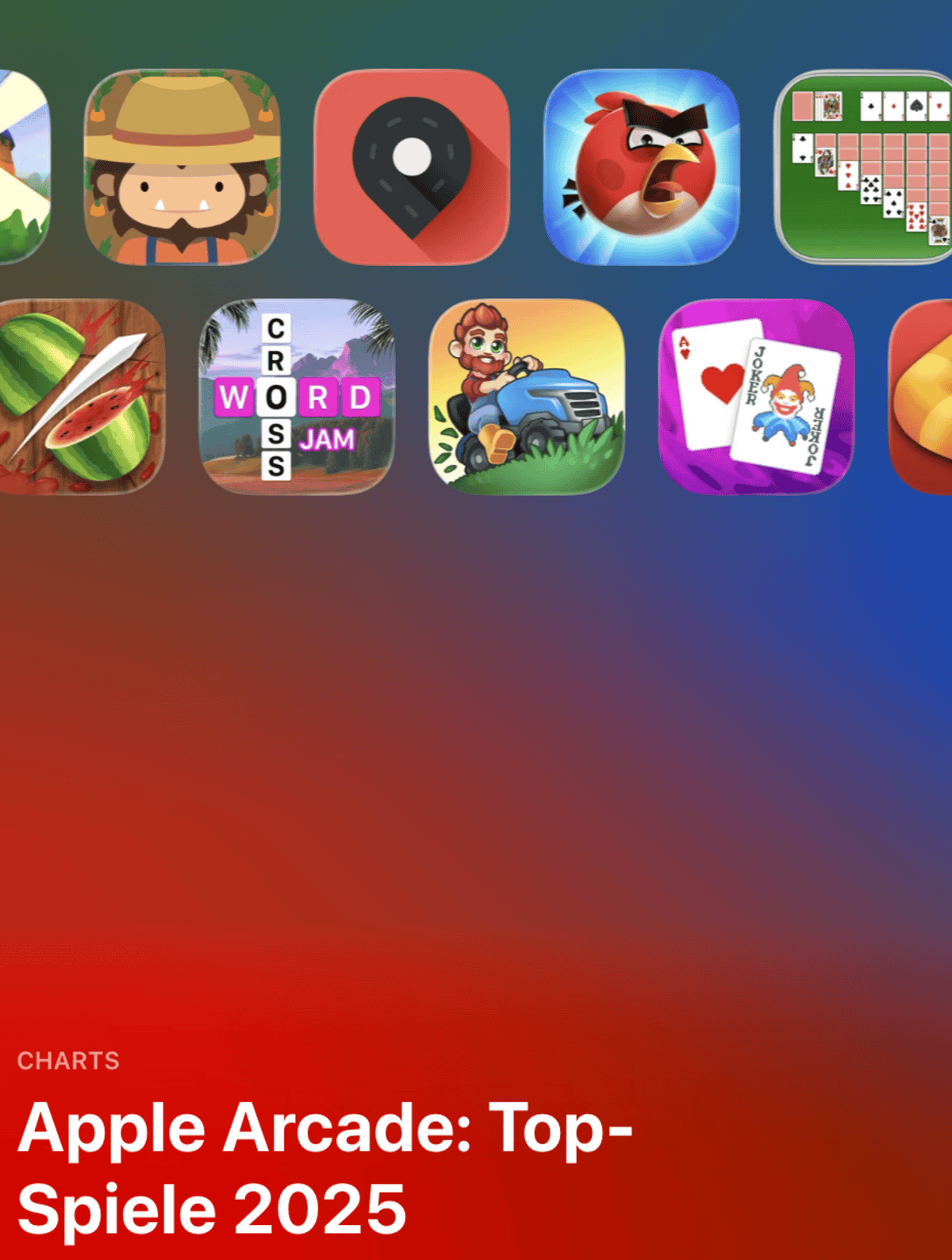 Die Übersicht im deutschen App Store ist für iOS in drei Teile gegliedert. Die App-Charts 2025 teilen sich auf in die App-Charts und die Spiele-Charts. Außerdem nennt der iPhone-Hersteller die Top-Titel seiner Spiele-Flatrate Apple Arcade.