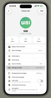 Um die neue Funktion aufzurufen, klickt man einfach im oberen Bereich von WhatsApp auf das Bild des Chatpartners. Es erscheint das gewohnte Menü, das jetzt um den Eintrag „Manage Storage“ erweitert wurde. Die Meta-Entwickler haben die separate Speicherverwaltung zwischen die Schaltflächen „In Fotos speichern“ und „Selbstlöschende Nachrichten“ gepackt.