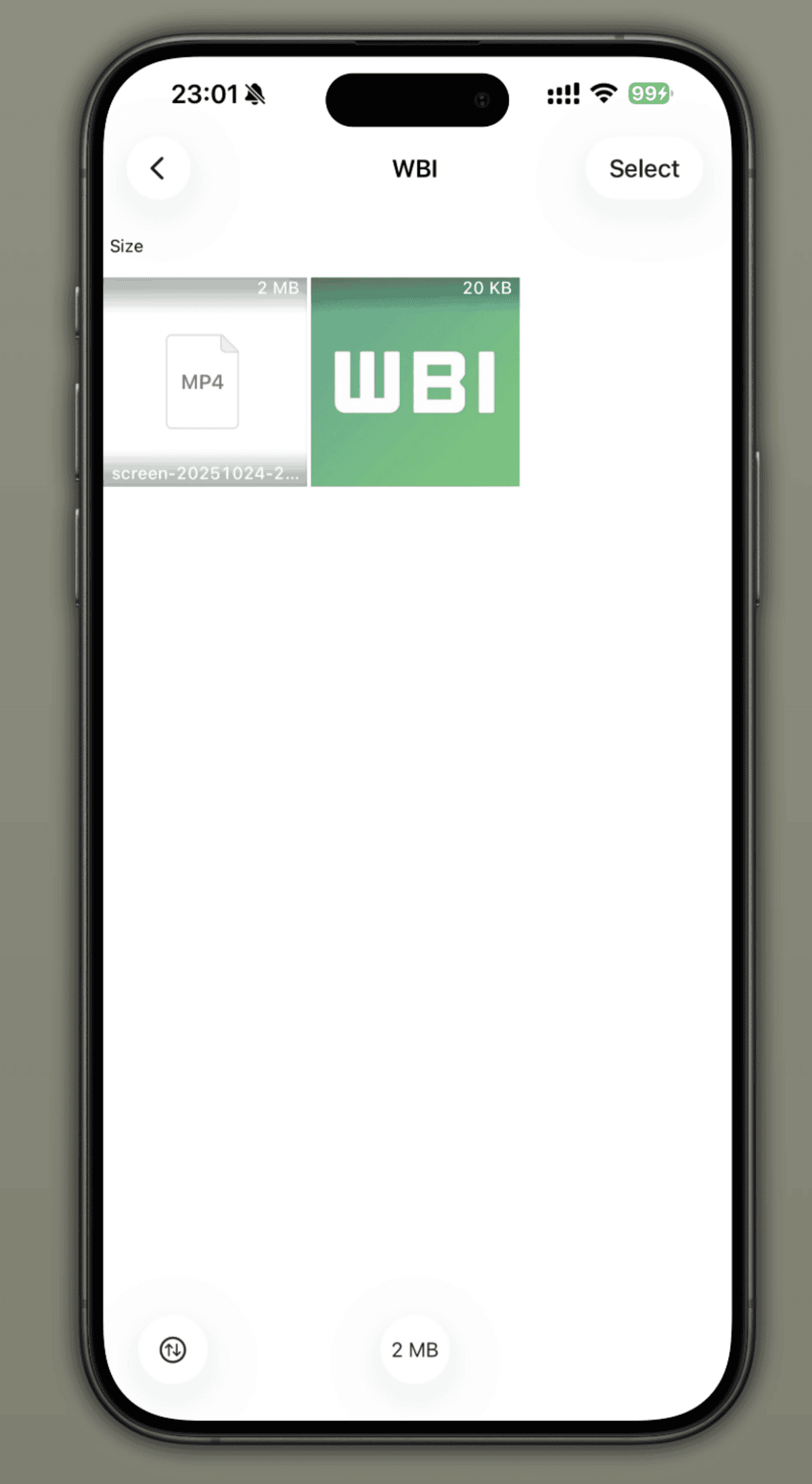 Im unteren Bereich wird mittig der genutzte Speicherplatz aller Dateien angezeigt. Links daneben findet man einen Button der ein Drop-down-Menü mit weiteren Kriterien zum Filtern öffnet, darunter „Neueste“, „Älteste“ und „Größte“.