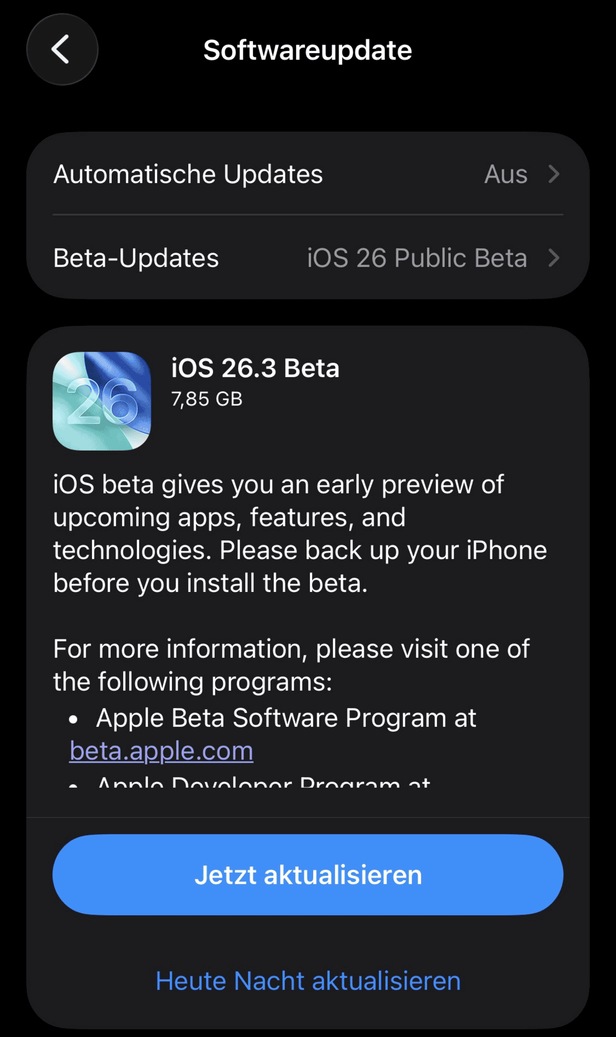 Mittlerweile steht die zweite Beta von iOS 26.3 auf den Servern von Apple auch für private Tester zum Ausprobieren bereit. Die Public Beta ist für alle zugänglich, die über einen kostenlosen Account beim Apple Beta Software-Programm verfügen. Die Installation läuft auf dem iPhone, wie man es von regulären Updates kennt, Over-the-Air über den Menüpunkt „Software-Updates“ in den Einstellungen.
