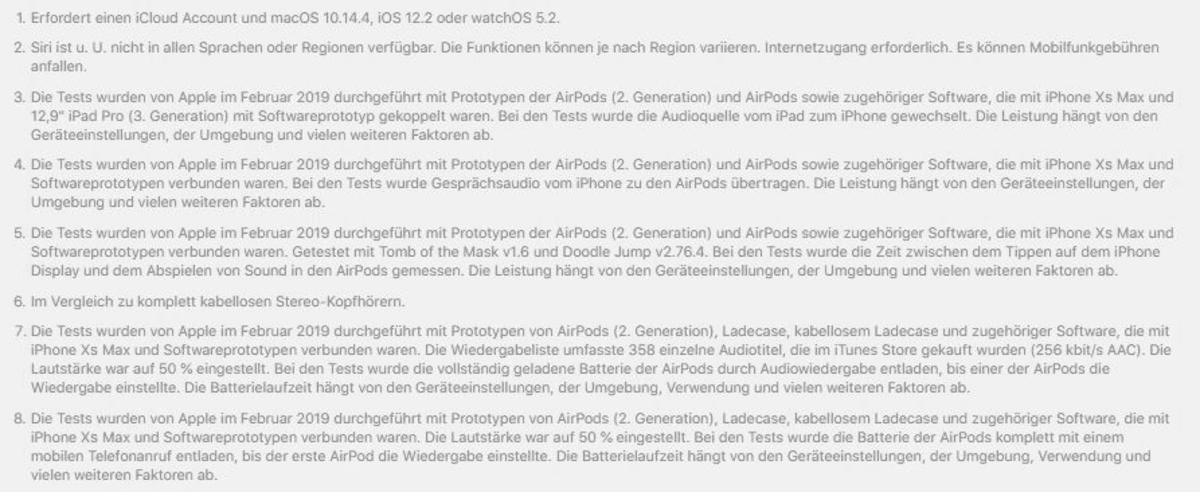 Vorgestern hat Apple ein neues Modell der AirPods angekündigt. Die AirPods mit Siri-Unterstützung und kabellosem Ladecase können auf der Webseite des iPhone-Herstellers bestellt werden. Als Lieferdatum war für die ersten Besteller der 26. März vorgesehen. In der Fußnote auf der Bestellseite hat Apple den Hinweis vermerkt, dass für den Betrieb der neuen AirPods zusammen mit einem iPhone mindestens iOS 12.2 installiert sein muss.