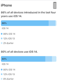 Apple hat auf seiner Webseite für Entwickler frische Zahlen zur Adaption von iOS 14 und iPadOS 14 veröffentlicht. Daraus geht hervor, dass iOS 14 auf 86 Prozent aller neuen iPhones installiert ist. Das iPad liegt mit 84 Prozent knapp dahinter.