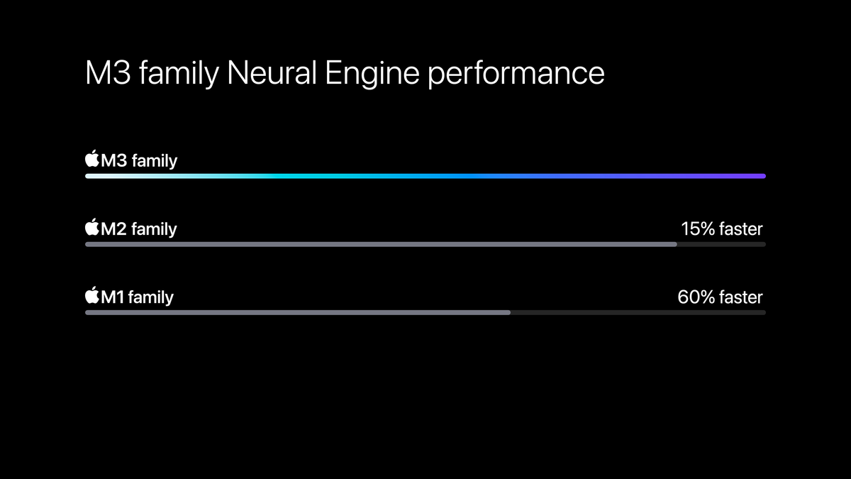 Die Benchmarks zeigen, dass der M3 23 Prozent schneller arbeitet als der M2. Im Vergleich zum M1 sind es sogar satte 41 Prozent. Laut Apple sollen Computer auf Basis des M3 dabei nicht mehr Energie verbrauchen.