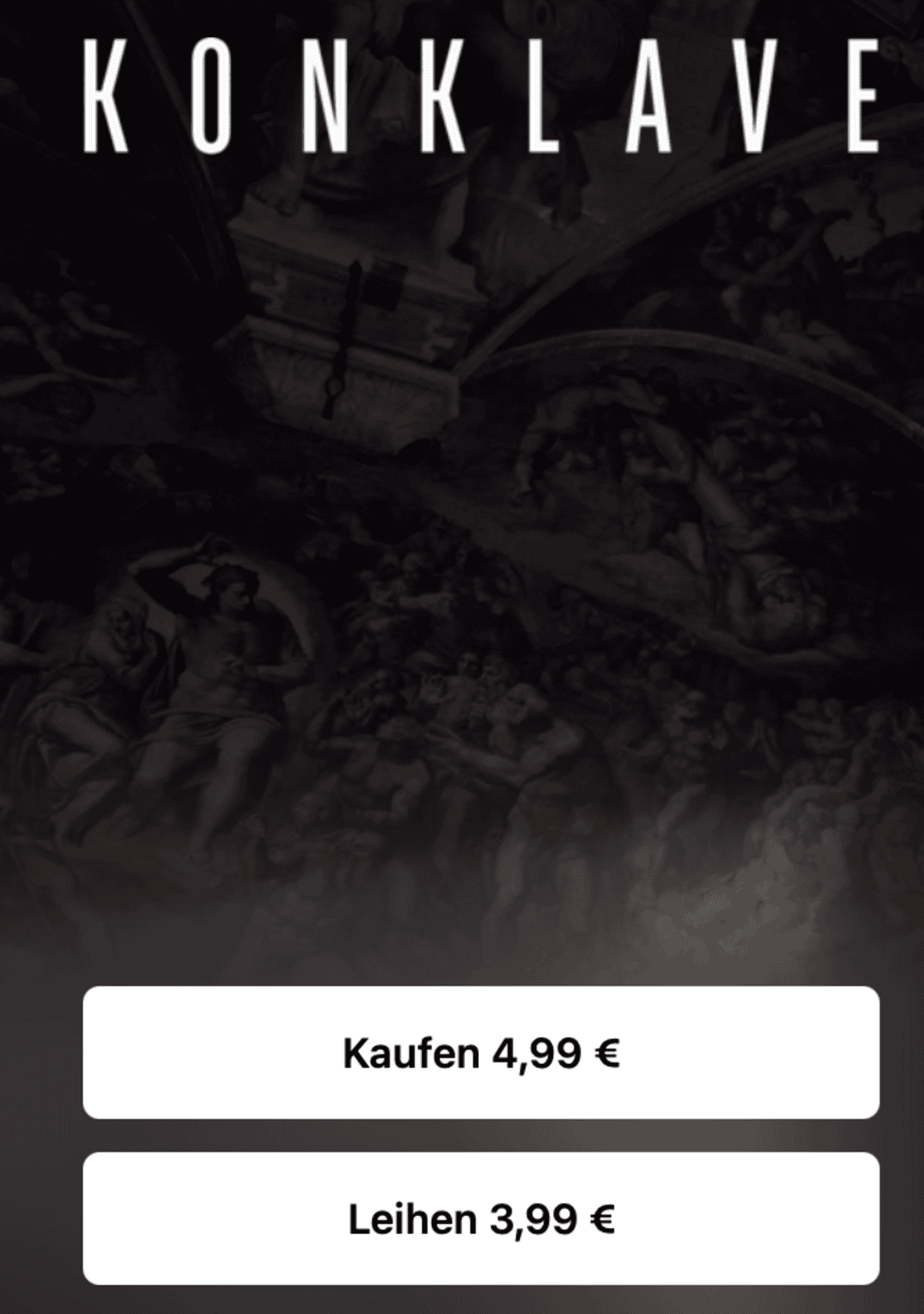 Preis: 4,99 Euro (abgelaufen, neuer Preis 9,99 Euro)Erschienen: 2025Dauer: 1 Stunde, 47 MinutenFreigabe: Ab 16 JahrenWertung bei TOMATOMETER: 84 %14. Dezember: „Konklave “
