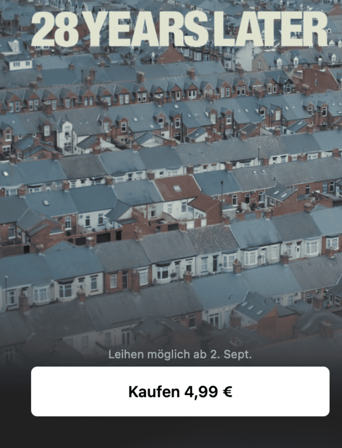 Preis: 4,99 Euro (abgelaufen, neuer Preis 7,99 Euro)Erschienen: 2025Dauer: 2 Stunden, 9 MinutenFreigabe: Ab 12 JahrenWertung bei TOMATOMETER: 83 %30. Dezember: „28 Years Later “