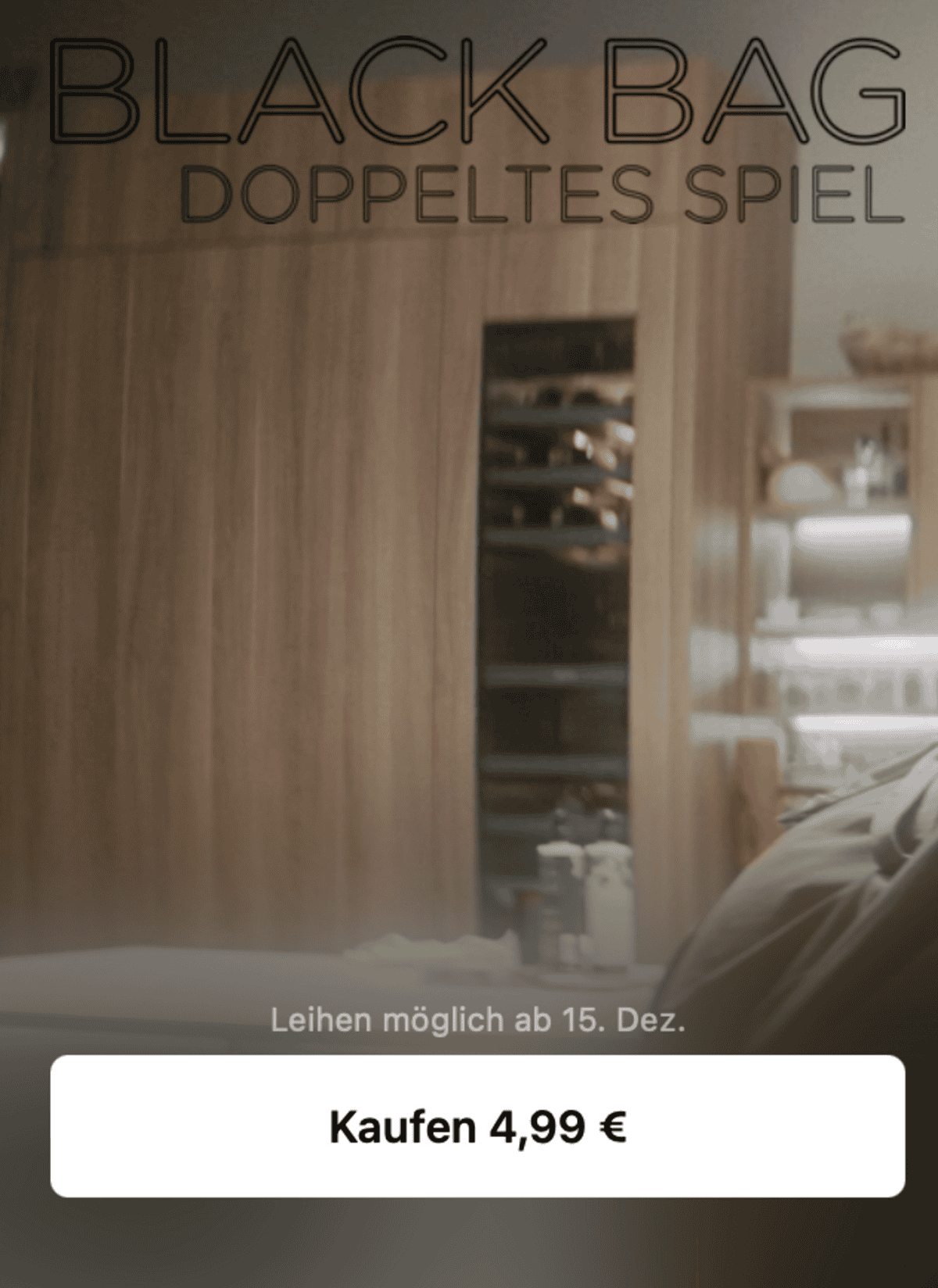 Preis: 4,99 Euro (abgelaufen, neuer Preis 13,99 Euro)Erschienen: 2025Dauer: 2 Stunden, 17 MinutenFreigabe: Ab 16 JahrenWertung bei TOMATOMETER: 97 %11. Dezember: „Black Bag – Doppeltes Spiel “