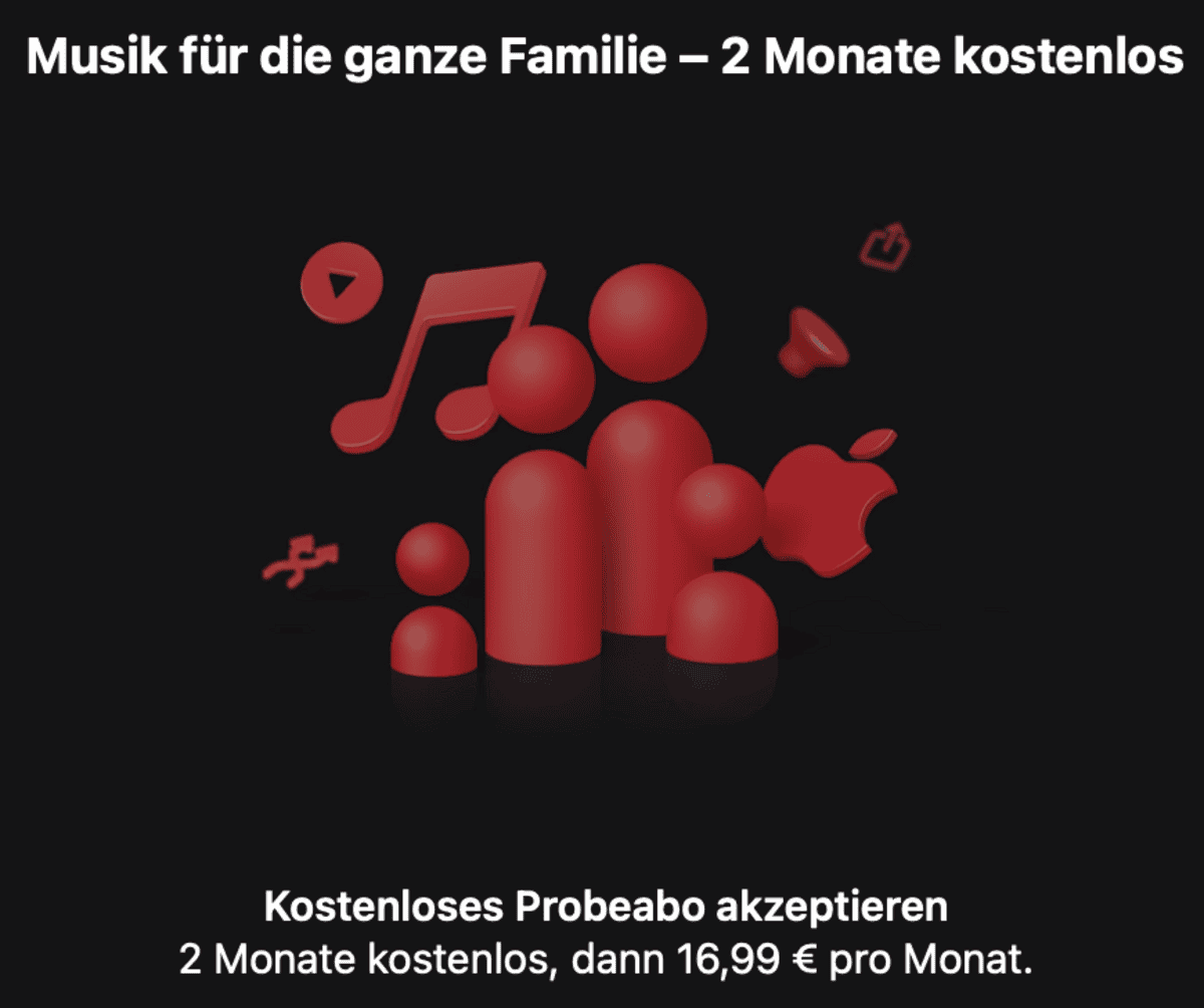 Wollt ihr Apple Music ausprobieren, ist jetzt der ideale Zeitpunkt dafür. Statt dem einmonatigen Testabo könnt ihr euch in der Musik-App im Moment zwei kostenlose Monate für das Einzel- und das Familienabo abholen.