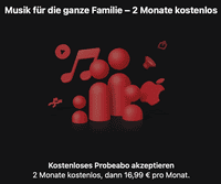 Dabei scheint es egal zu sein, ob man Apple Music in der Vergangenheit bereits gebucht hat. Mein Apple Account ist, was Gratis-Abos betrifft, definitiv vorbelastet. Die aktuelle Werbeaktion wird mir auf allen drei Geräten dennoch angezeigt, allerdings nur in der Musik-App. Zur Wahl stehen dort das Einzel- sowie das Familienabo.