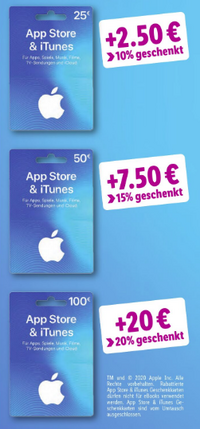 Das Jahr 2020 neigt sich dem Ende. Es war ein turbulentes und außergewöhnliches Jahr, und mit dem kommenden Mittwoch steht uns ein harter Lockdown bevor. Die Lebensmittelgeschäfte bleiben jedoch geöffnet. So auch LIDL, wo man für die iTunes-Karten im Wert von 25, 50 und 100 Euro jeweils ein gestaffeltes Bonusguthaben von bis zu 20 Prozent erhält. Bei Saturn gelten mit festen 15 Prozent für alle drei Karten andere Konditionen, allerdings nur noch bis zum 16. Dezember, was dann wegen der Ladenschließungen aber nicht mehr ins Gewicht fällt.