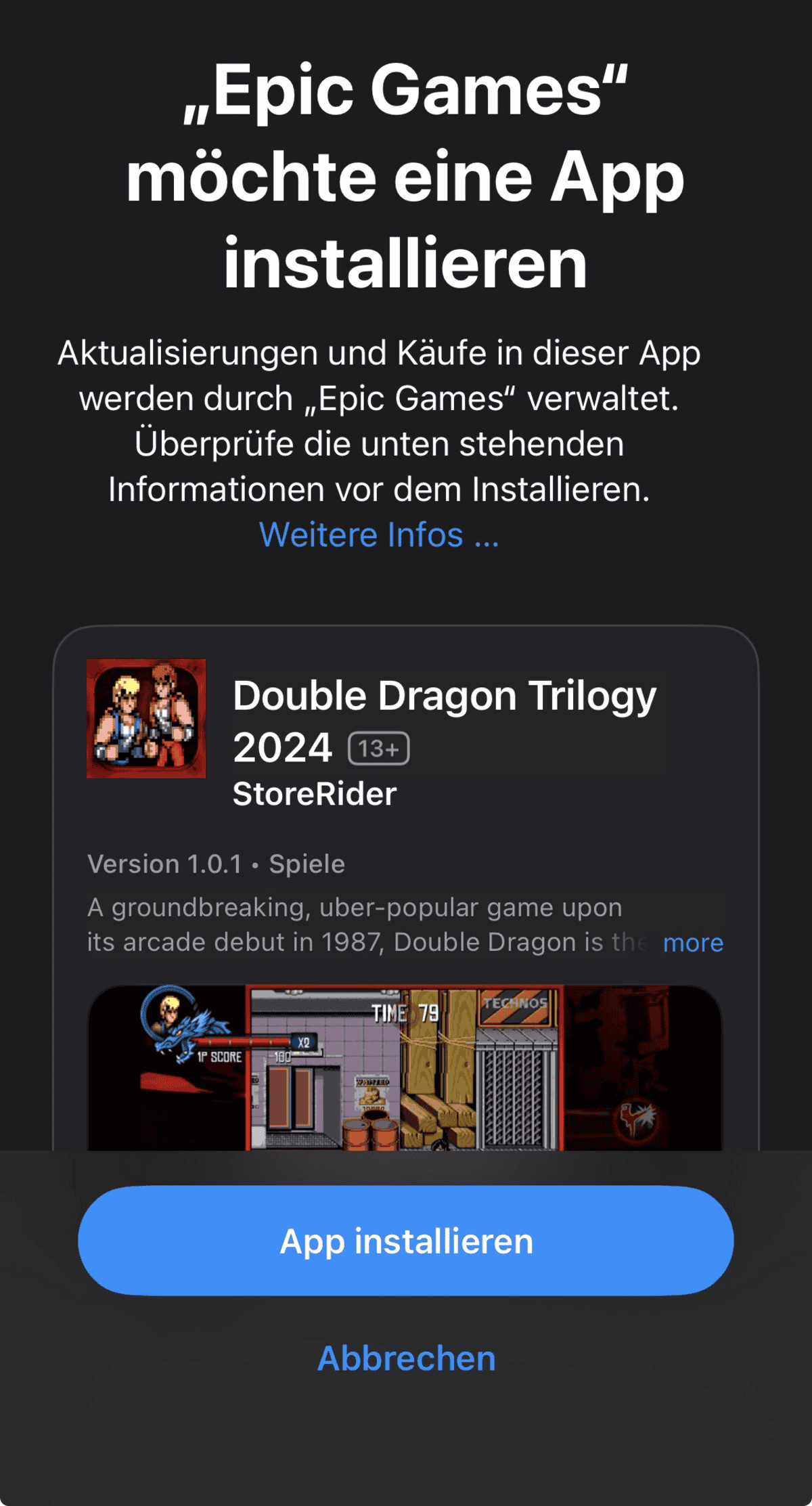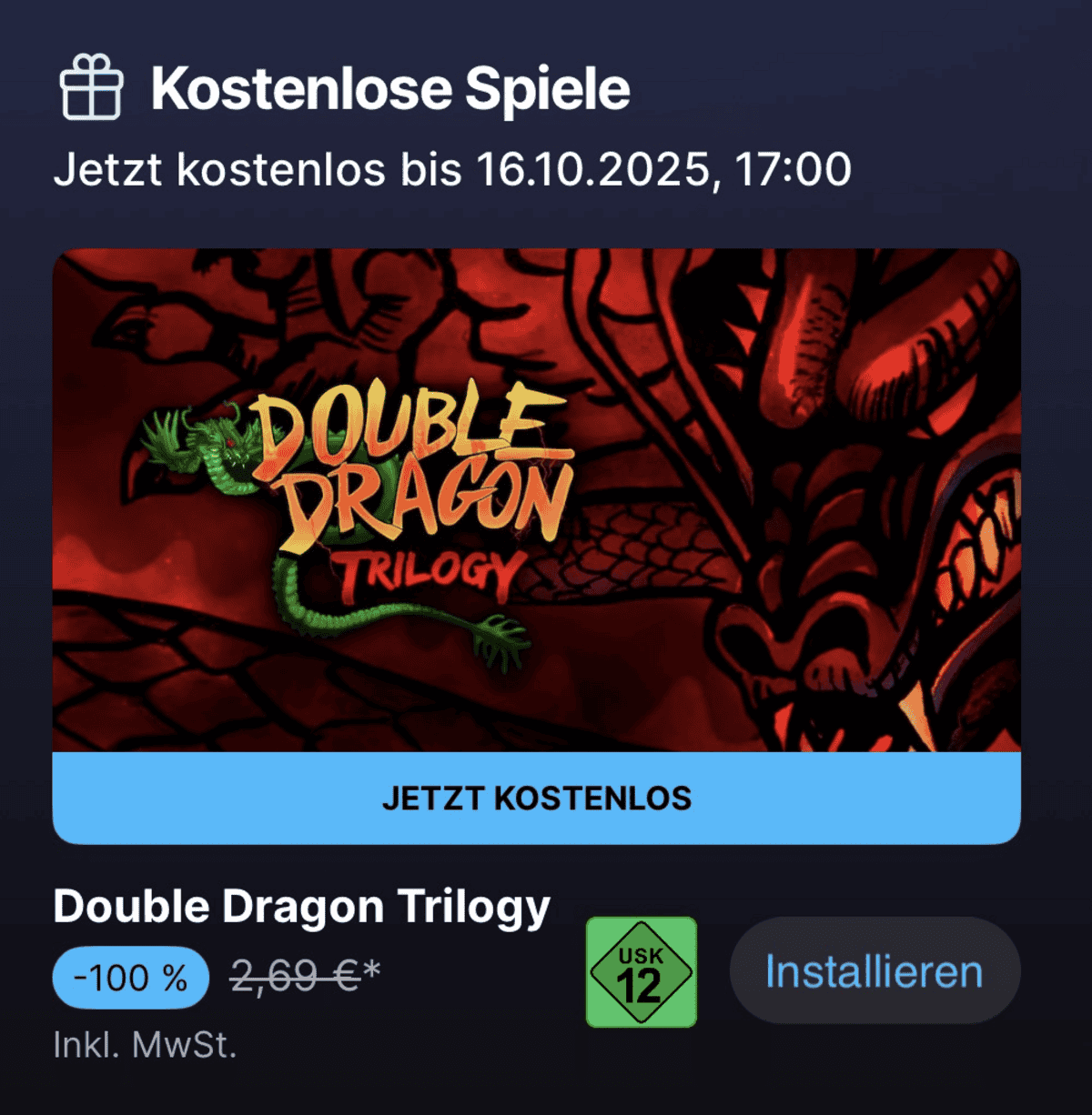 Bis zum kommenden Donnerstag um 17 Uhr könnt ihr eurem Epic-Account die „Double Dragon Trilogy“ für iOS und iPadOS kostenlos hinzufügen. Das Beat 'em up kostet normalerweise 2,69 Euro und kann in zwei Spielmodi sowie drei Schwierigkeitsstufen gespielt werden. Im Games Store auf der Webseite von Epic wird zudem die Vollversion von „Gravity Circuit“ und das „Abtrünniger Geselle-Paket“ für „Albion Online“ verschenkt.