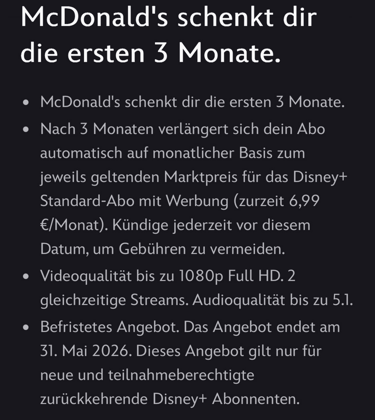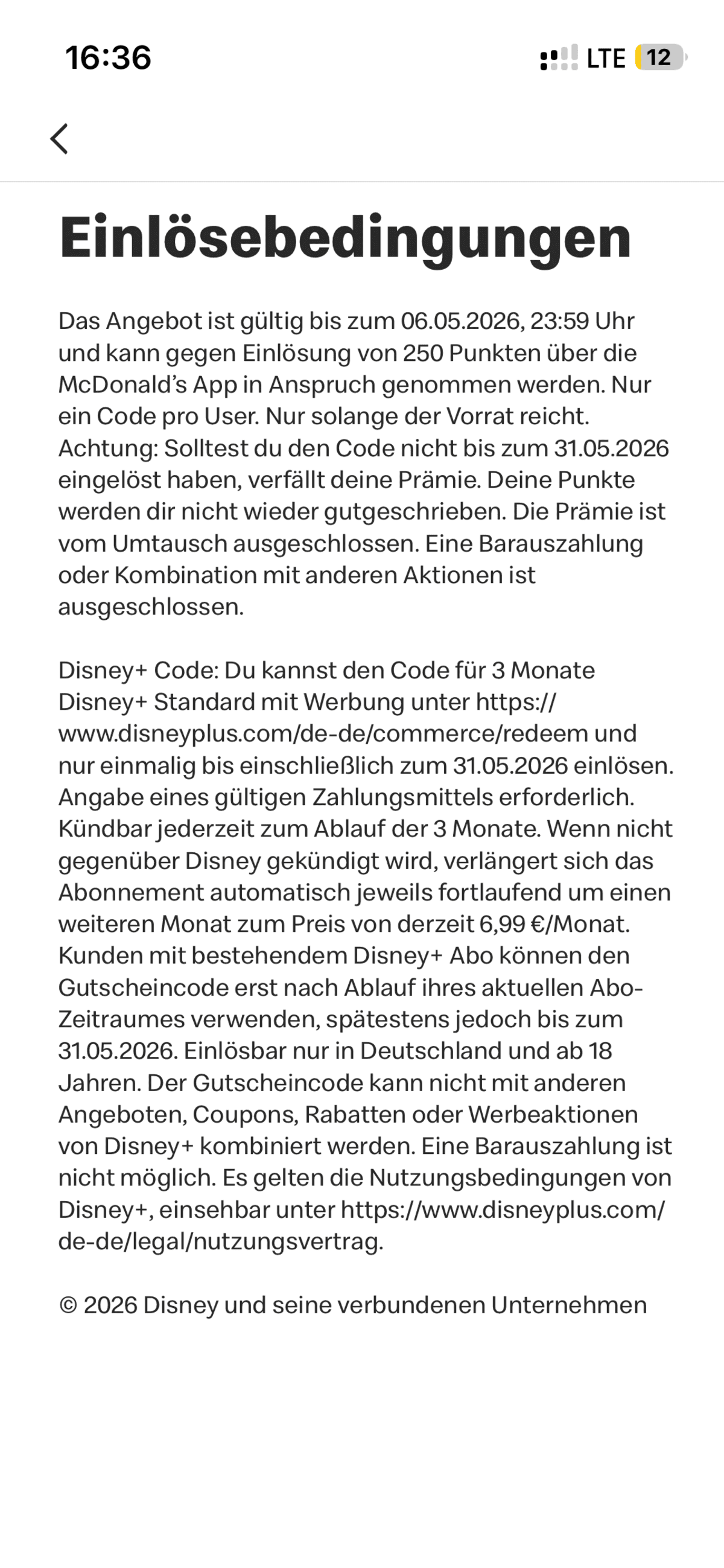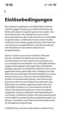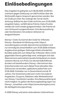 Aus den Angebotsbedingungen geht hervor, dass man den Gutscheincode für das Abo „Standard mit Werbung“, den man in der App von McDonald’s erhält, bis zum 31. Mai 2026 bei Disney einlösen muss: