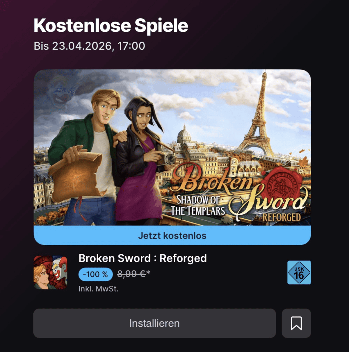 In dieser Woche gibt es im mobilen Games Store von Epic ein echtes Highlight für Fans von alten Adventures. Das Remake vom ersten Teil der Spielreihe „Baphomets Fluch“ im Wert von 8,99 Euro gibt es für iOS und iPadOS gratis.
