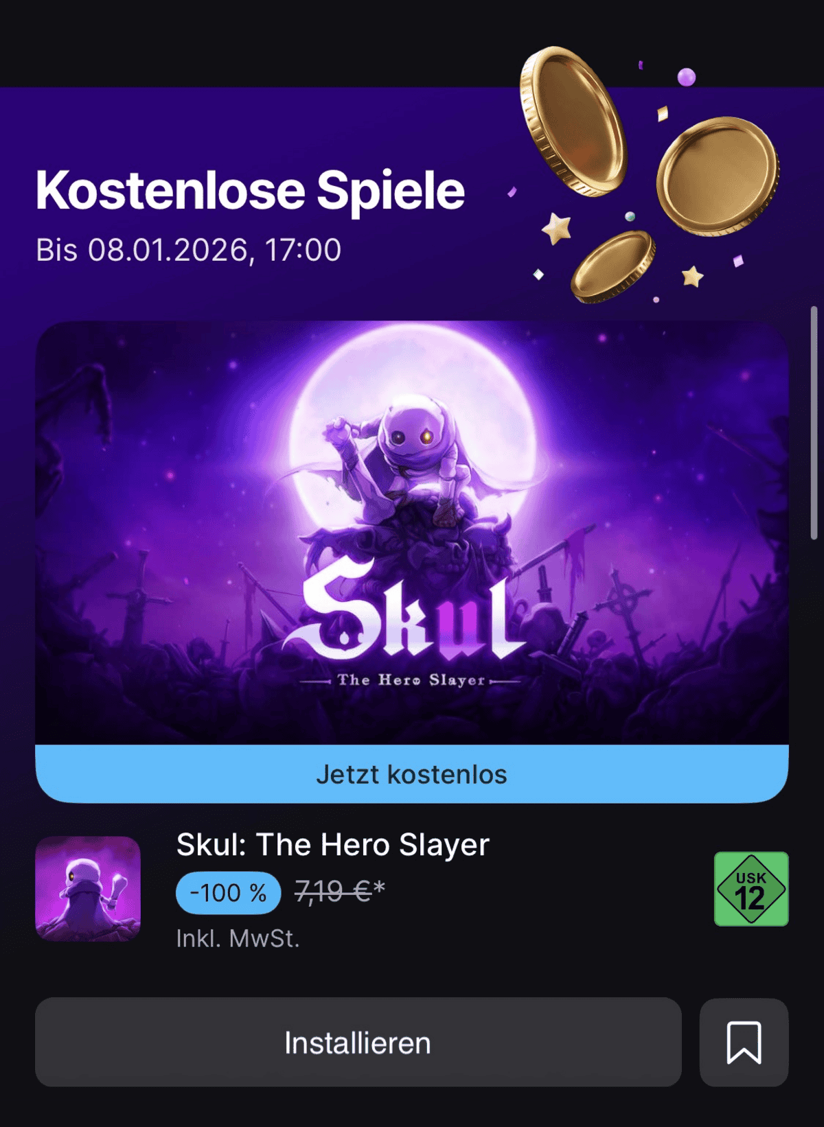 Neben dem Gratis-Spiel im regulären Games Store von Epic gibt es jede Woche auch ein kostenloses Spiel für das iPhone und das iPad. Um sich die kostenlosen Angebote für iOS und iPadOS zu sichern, benötigt man lediglich die mobile Variante von Epics Download-Plattform. Bis zum nächsten Donnerstag könnt ihr euch dort die Vollversion von „Skul: The Hero Slayer“ abholen, die sonst für 7,19 Euro verkauft wird.