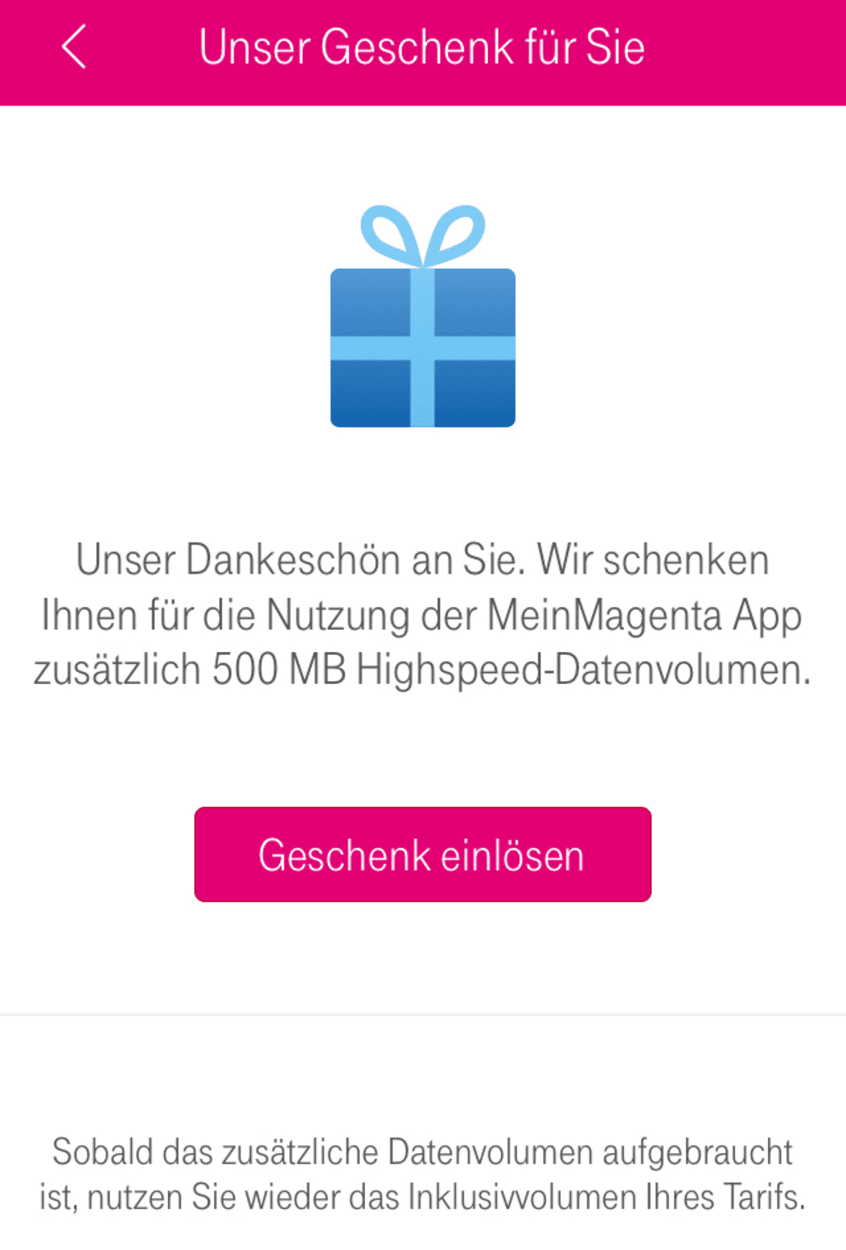 Nachdem ihr in der App MeinMagenta die PUK der SIM-Karte hinterlegt habt, klickt ihr einfach auf die Buttons "Ihr Geschenk ansehen" und "Geschenk einlösen", um die 500 MB freizuschalten. Diese stehen nach der Buchung direkt zur Verfügung.