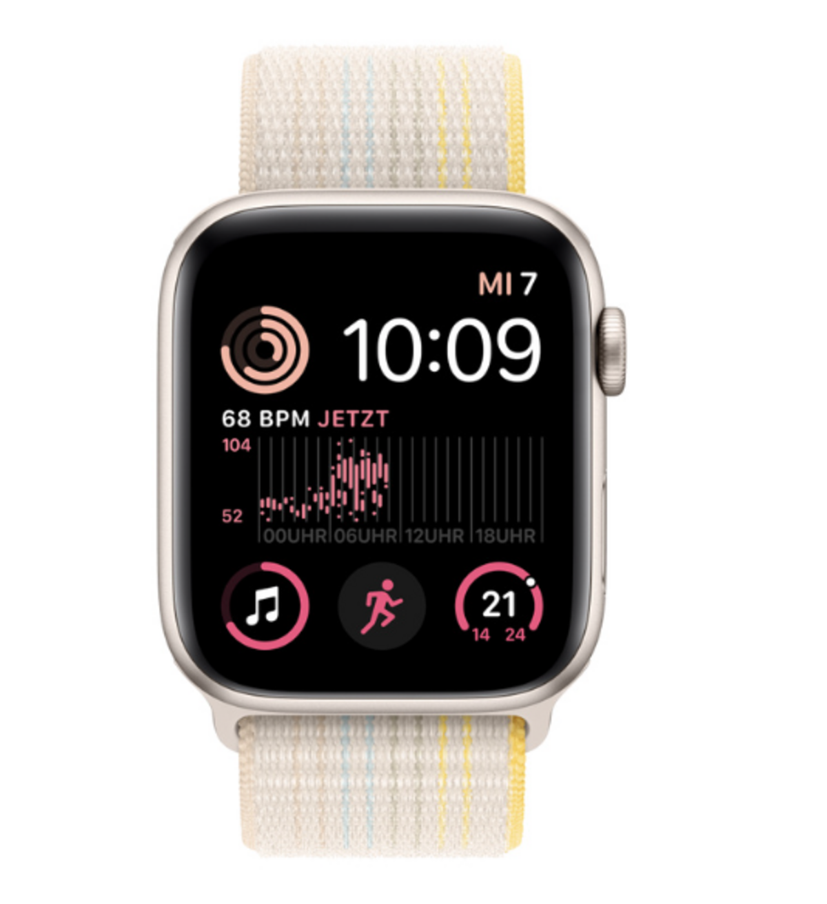 Die neue Apple Watch SE wird mit einem Aluminiumgehäuse in den Farben Sonnenlicht, Agavengrün, Kalkrosa, Sturmblau, Mitternacht und Polarstern verkauft.