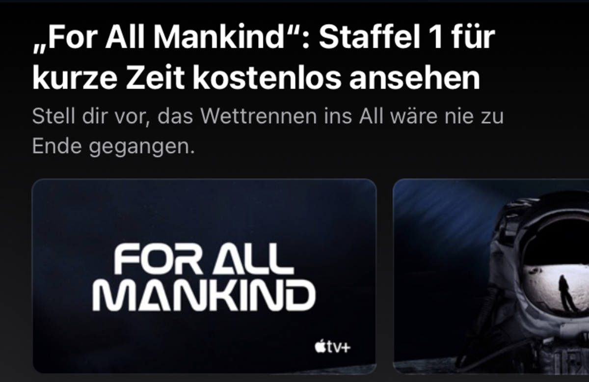 Im Moment ist das Angebot von Apple noch verfügbar. Die komplette erste Staffel von "For All Mankind" kann online oder offline kostenlos und in 4K angeschaut werden. Da wir nicht wissen, wie lange die zehn Folgen noch gratis angeboten werden, sollten sich interessierte Nutzer ohne einem Abo von Apple TV+ unbedingt zuschlagen.