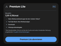 Gleiches gilt für YouTube Premium Lite: Keine In-App-Käufe in der iPhone- oder iPad-App tätigen, da hier das Lite-Abo mit 7,99 Euro monatlich berechnet wird. Auf das Jahr hochgerechnet, spart man auf diesem Weg zwölf Euro.