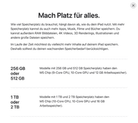 Während des Bestellvorgangs ist auf den ersten Blick allerdings nicht ersichtlich, mit wie viel Arbeitsspeicher das iPad Pro bestückt wird. Diese Information erhält man auf zwei Wegen: Entweder man durchforstet die technischen Spezifikationen auf der Apple-Webseite oder man klickt während der Konfiguration des Festplattenspeichers auf das „Plus“-Symbol bei dem Hinweis „Du bist dir nicht sicher, wie viel Speicherplatz du wählen sollst? Mach dir ein besseres Bild davon, wie viel Speicherplatz du brauchen wirst.“